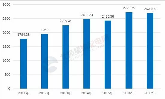 2011-2017年電力變壓器行業(yè)的銷售收入整體呈上漲態(tài)勢(shì),2016年電力變壓器行業(yè)實(shí)現(xiàn)銷售收入2726.75億元,同比增長12.24%,2017年電力變壓器行業(yè)實(shí)現(xiàn)銷售收入2693.55億元,同比下降1.22%。