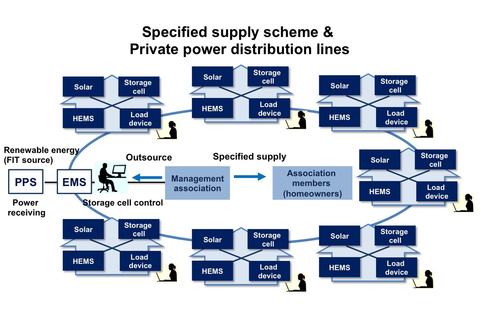 該管理協(xié)會(huì)由住宅區(qū)內(nèi)117個(gè)住宅的屋主組成。該協(xié)會(huì)已將蓄電池控制管理外包給該領(lǐng)域的專(zhuān)家ENERES?;谥荚诳刂茝男铍姵叵騾f(xié)會(huì)會(huì)員(居民)供電的具體方案,它將能夠操作EMS(*8)系統(tǒng),并采用興銀租賃根據(jù)自身的金融專(zhuān)業(yè)知識(shí)開(kāi)發(fā)的環(huán)境解決方案向這一整個(gè)區(qū)域提供電力覆蓋,進(jìn)而推出專(zhuān)用配電線。