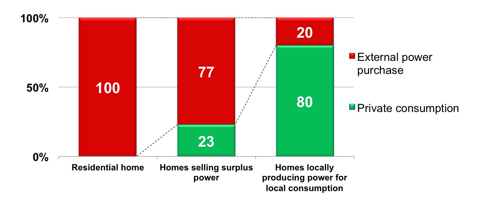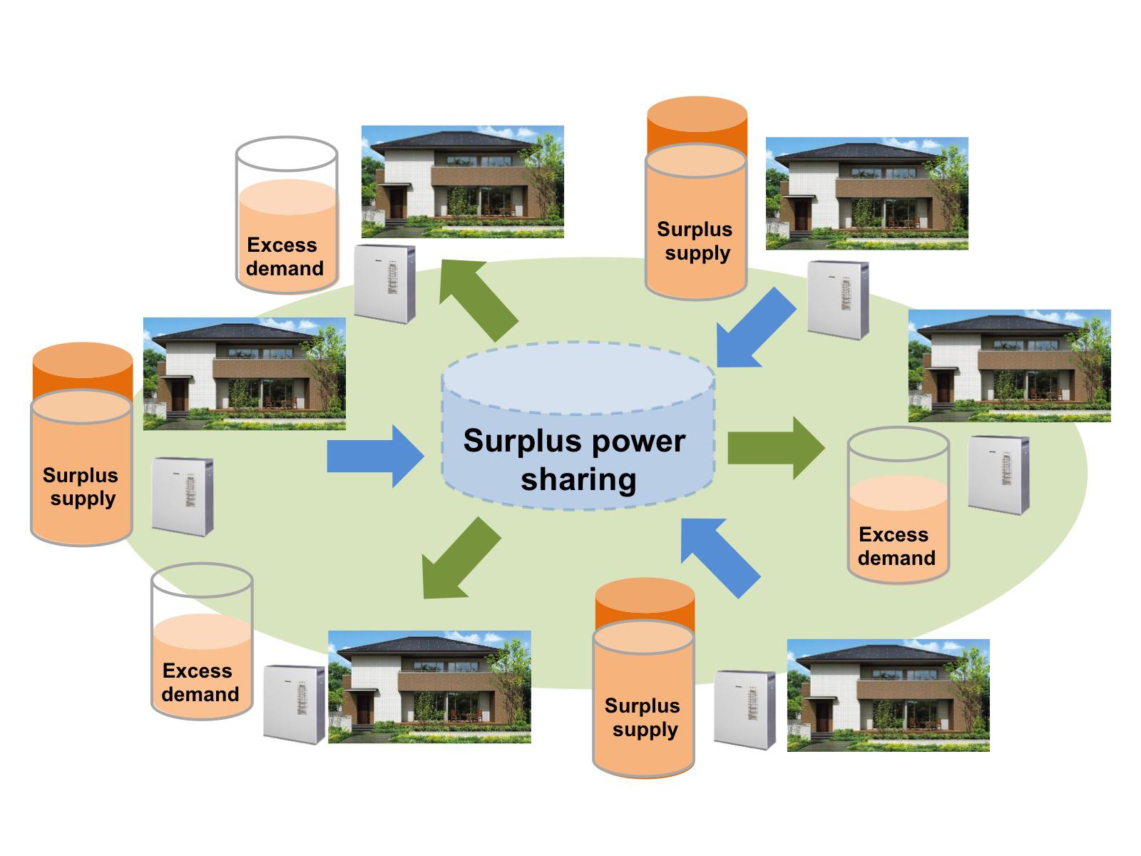 在該項(xiàng)目中,所有家庭均安裝了太陽(yáng)能發(fā)電機(jī)、蓄電池和HEMS。安裝在每戶家庭中的蓄電池相互連接形成網(wǎng)絡(luò)。儲(chǔ)存在蓄電池中的電力(11.2千瓦時(shí))可由該區(qū)的117戶家庭共享。它就像一個(gè)擁有1.3兆瓦時(shí)電力的巨型蓄電池。電力過(guò)剩的家庭可與電力緊缺的家庭共享。此舉將無(wú)需從外部購(gòu)買(mǎi)電能,并能夠盡量利用該地區(qū)內(nèi)的太陽(yáng)能發(fā)電。