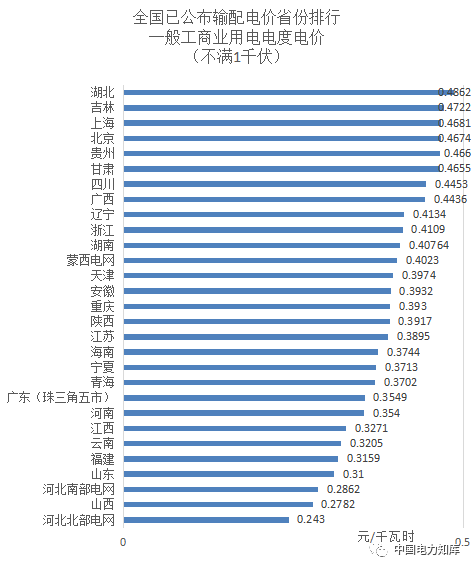 全國(guó)已公布輸配電價(jià)省份排行一、一般工商業(yè)用電輸配電價(jià)