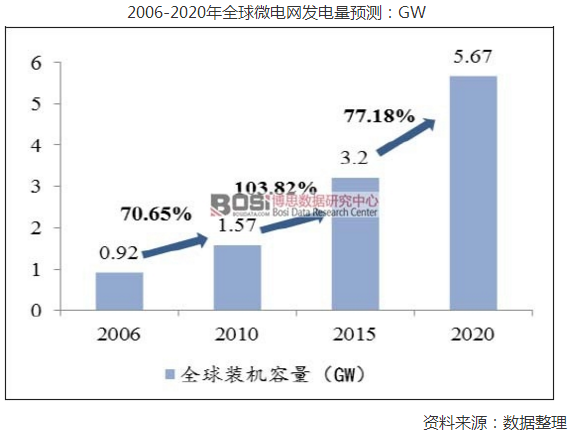 博思數(shù)據(jù)發(fā)布的《2017-2022年中國微電網(wǎng)市場競爭格局分析與投資前景研究咨詢報(bào)告》,全球微電網(wǎng)快速發(fā)展。全球微電網(wǎng)市場規(guī)模穩(wěn)步成長,目前全球規(guī)劃、在建以及投入運(yùn)行的微電網(wǎng)示范工程超過400個,輻射到北美、歐洲、東亞、非洲、拉美等地區(qū)。預(yù)計(jì)2023年微電網(wǎng)產(chǎn)業(yè)覆蓋到的市場規(guī)模將達(dá)到1550億美元以上。