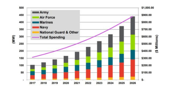 Navigant Research因此得出結(jié)論:通過使用微型電網(wǎng),國防部將能夠減少其目前在其523座設施和28萬座建筑物上花費的40億美元能源消耗。此外,Navigant預測,年度微電網(wǎng)的支出將從2017年的4.534億美元增加到2026年的14億美元。