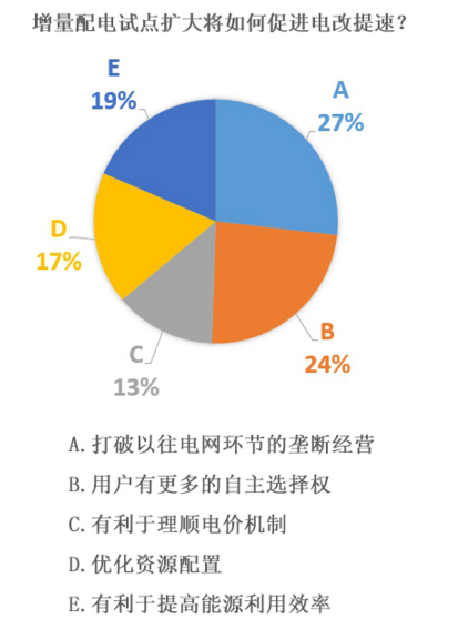 調(diào)查結(jié)果顯示,一半以上的受訪者認為增量配電試點擴大意味著打破以往電網(wǎng)環(huán)節(jié)的壟斷經(jīng)營,同時用戶有更多的自主選擇權(quán)。認為增加增量配電業(yè)務(wù)改革試點也有利于理順電價機制、優(yōu)化資源配置、提高能源利用效率的受訪者比例相當,增量配電業(yè)務(wù)改革從多角度為促進電改提速加油助力。
