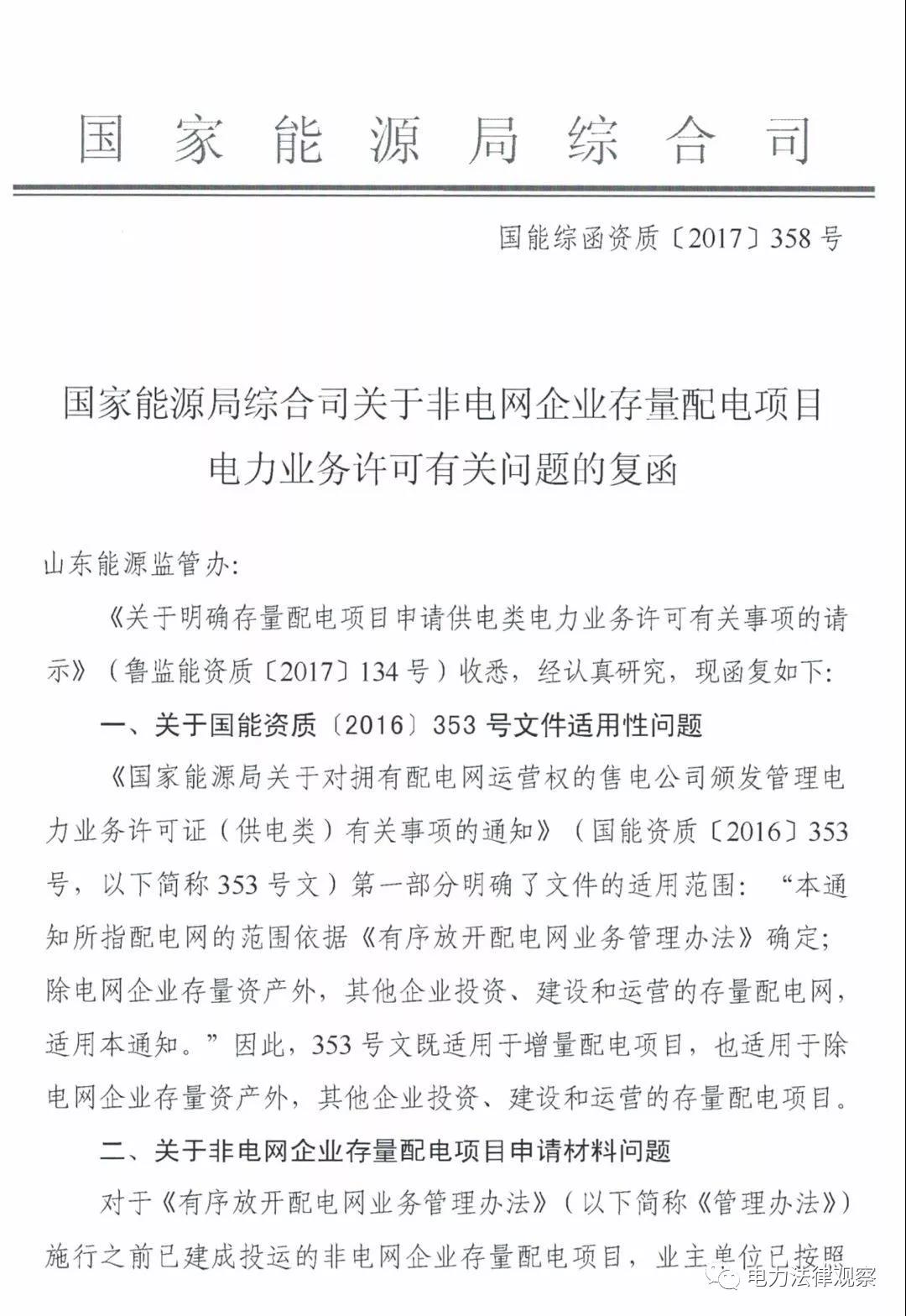 近日,國(guó)家能源局綜合司做出《關(guān)于非電網(wǎng)企業(yè)存量配電項(xiàng)目電力業(yè)務(wù)許可有關(guān)問(wèn)題的復(fù)函》(國(guó)能綜函資質(zhì)[2017]358)。觀茶君閱讀《復(fù)函》之后發(fā)現(xiàn),該《復(fù)函》給非電網(wǎng)企業(yè)存量配電項(xiàng)目業(yè)務(wù)許可證的辦理帶來(lái)一系列利好消息: