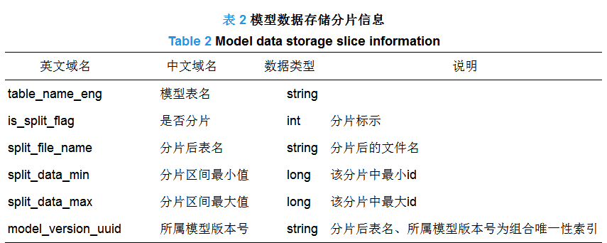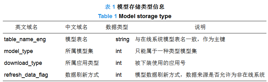 用戶可定義不同應(yīng)用模型集合并將模型表進(jìn)行歸類,同一模型表只能屬于一種類型模型集,未來版本模型生成時(shí)只需按照所需維護(hù)模型集類型選擇即可。模型存儲(chǔ)類型信息內(nèi)容如表1所示。