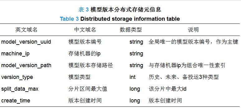 用戶可以方便、快捷地根據(jù)需求將不同類型的模型集組合構(gòu)建成一個(gè)模型版本,模型版本包含了模型集中所有模型表對應(yīng)的數(shù)據(jù)庫文件、模型維護(hù)增量信息,與之對應(yīng)的是操作系統(tǒng)中物理存儲(chǔ)目錄,是存儲(chǔ)單個(gè)模型版本模型數(shù)據(jù)的邏輯單位。在生成未來模型版本時(shí),分布式存儲(chǔ)元數(shù)據(jù)服務(wù)在多機(jī)中選擇一臺(tái)已存儲(chǔ)版本較少、系統(tǒng)資源占用率較低的機(jī)器,達(dá)到多版本存儲(chǔ)的負(fù)載均衡,并在這臺(tái)機(jī)器上分配模型版本的唯一目錄路徑;根據(jù)該版本包含模型集的數(shù)據(jù)表范圍在該目錄中生成相應(yīng)的數(shù)據(jù)庫文件。模型版本分布式存儲(chǔ)元信息表如表3所示。