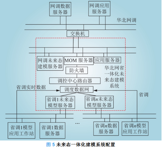 本文介紹的大電網(wǎng)未來態(tài)一體化模型構(gòu)建和融合技術(shù)已在國家電網(wǎng)公司華北分部投入應(yīng)用。圖5是華北網(wǎng)省未來態(tài)一體化建模系統(tǒng)的系統(tǒng)配置。