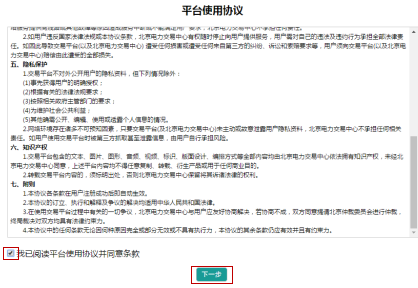 B、完整閱讀平臺使用協(xié)議之后,勾選我已閱讀,點(diǎn)擊下一步,如下圖: