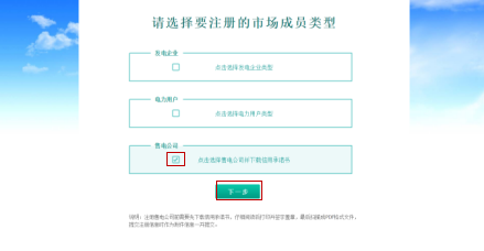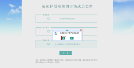 C、選擇售電公司,系統(tǒng)會自動下載信用承諾書模板,然后點(diǎn)擊下一步,在彈出的提示框中點(diǎn)擊“是”,進(jìn)入信息錄入界面,如下圖