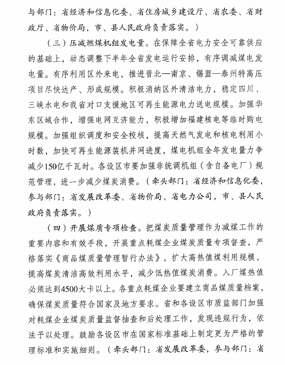 近日江蘇省人民政府辦公廳發(fā)布了關(guān)于進(jìn)一步推進(jìn)減煤工作通知的特急文件。文件明確提出以下要求:在保障全省電力安全可靠供應(yīng)的基礎(chǔ)上動(dòng)態(tài)調(diào)整下半年全省發(fā)電運(yùn)行安排,有序調(diào)減煤電發(fā)電量。加強(qiáng)組織調(diào)度和安全校