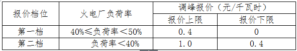 第二十一條 實時深度調峰交易采用“階梯式”報價方式和價格機制,火電企業(yè)在不同時期分兩檔浮動報價,具體分檔及報價上、下限參見下表: