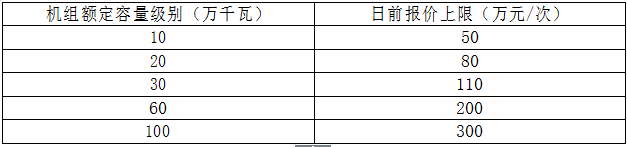 第三十四條 火電企業(yè)按照機組額定容量對應的應急啟停調峰服務報價區(qū)間浮動報價,各級別機組的報價上限見下表: