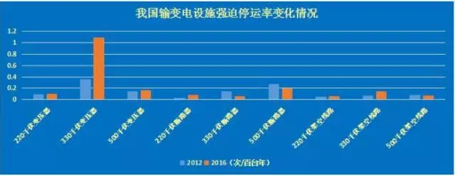 從強(qiáng)迫停運(yùn)率上看,近五年,我國(guó)變壓器、斷路器、架空線路三類輸變電設(shè)施強(qiáng)迫停運(yùn)率下降幅度較大。2016年,我國(guó)變壓器、斷路器、架空線路強(qiáng)迫停運(yùn)率,較2012年分別下降0.037次/百臺(tái)年、0.052次/百臺(tái)年和0.008次/百臺(tái)年。