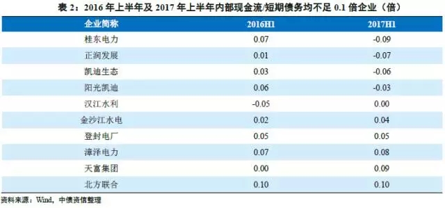 短期償債指標(biāo)方面,2017年6月末樣本企業(yè)現(xiàn)金類資產(chǎn)/短期債務(wù)為0.30倍,較去年同期(0.30倍)變化不大??紤]到電力行業(yè)涉及國計(jì)民生,外部支持力度較大,整體融資環(huán)境較好,短期償債表現(xiàn)仍較好。根據(jù)樣本數(shù)據(jù),2017年上半年內(nèi)部現(xiàn)金流/短期債務(wù)不足0.5倍的企業(yè)共49家(占樣本企業(yè)總數(shù)的90.74%),同比增長7家。此外,41家企業(yè)內(nèi)部現(xiàn)金流/短期債務(wù)有所下降(占樣本企業(yè)總數(shù)的75.93%)。