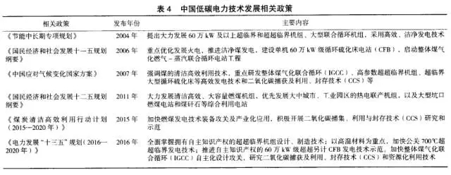 技術(shù)是經(jīng)濟(jì)發(fā)展的重要保障,低碳電力技術(shù)是火電行業(yè)的低碳化發(fā)展的核心要素。在我國(guó)陸續(xù)頒布的能源、電力政策中都對(duì)發(fā)展低碳電力技術(shù)作出了規(guī)劃,有關(guān)政策如表4所示