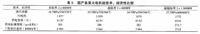 超臨界與超超臨界機(jī)組發(fā)電技術(shù)是目前發(fā)展較成熟、高效、經(jīng)濟(jì)的發(fā)電技術(shù)。火電廠超超臨界機(jī)組和超臨界機(jī)組是指鍋爐內(nèi)工質(zhì)(水)的壓力和溫度大于22.129MPa、374.15℃的機(jī)組,爐內(nèi)蒸汽溫度不低于593℃或蒸汽壓力不低于31MPa稱為超超臨界機(jī)組:我國(guó)各類火電機(jī)組技術(shù)、經(jīng)濟(jì)性比較如下表5所示。