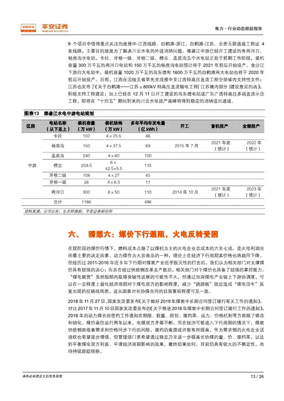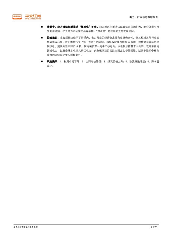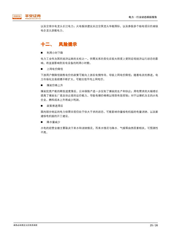 風險提示:1、利用小時下降;2、上網電價降低;3、煤炭價格上升;4、政策推進滯后;5、降水量減少。