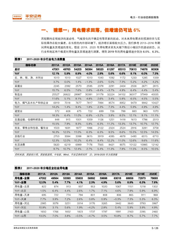 猜想一:用電需求回落,但增速仍可達6%。參考2013-2016年期間用電量及其增速的變化,從行業(yè)和地區(qū)兩個維度對用電量及其增速進行測算,得到2019年的用電量增速分別為6.0%、6.3%。