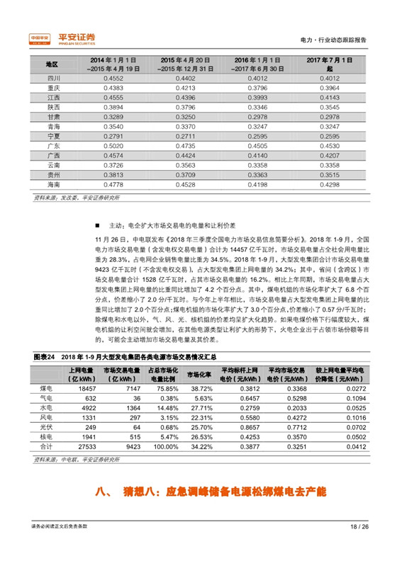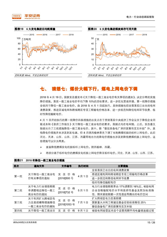 猜想七:煤價大幅下行,煤電上網電價下調。在降低上網電價以減輕工商業(yè)企業(yè)經營成本的政策導向下,能維持現(xiàn)有電價不下調已是最理想的結果。而如果煤價大幅下行,火電企業(yè)盈利空間顯著提升,那么上網電價就有可能被動或主動降低。