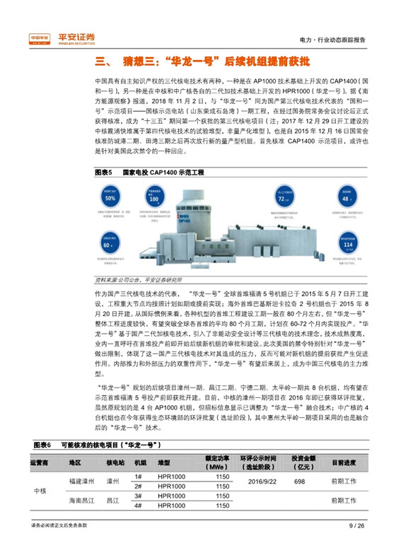 猜想三:“華龍一號”后續(xù)機組提前獲批。美國的核電技術轉讓禁令特別針對“華龍一號”做出限制,反而可能對新機組的提前獲批產生促進作用,“華龍一號”有望后來居上,成為中國三代核電的主力堆型。