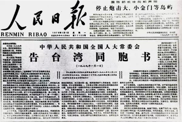 1979年元旦,全國人大常委會發(fā)表了《告臺灣同胞書》,鄭重宣示了爭取祖國和平統(tǒng)一的大政方針,明確提出了一系列發(fā)展兩岸關系、促進和平統(tǒng)一進程的政策措施。