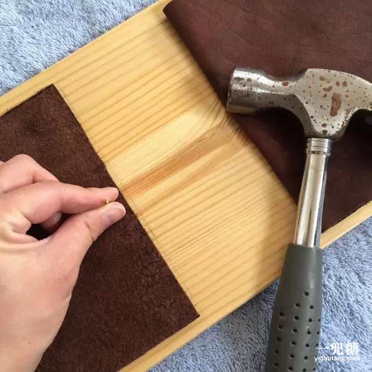 4、在皮革底層的中間先釘一顆釘子,然后將皮革上下折疊,在兩個(gè)角各釘一顆,口袋完成。