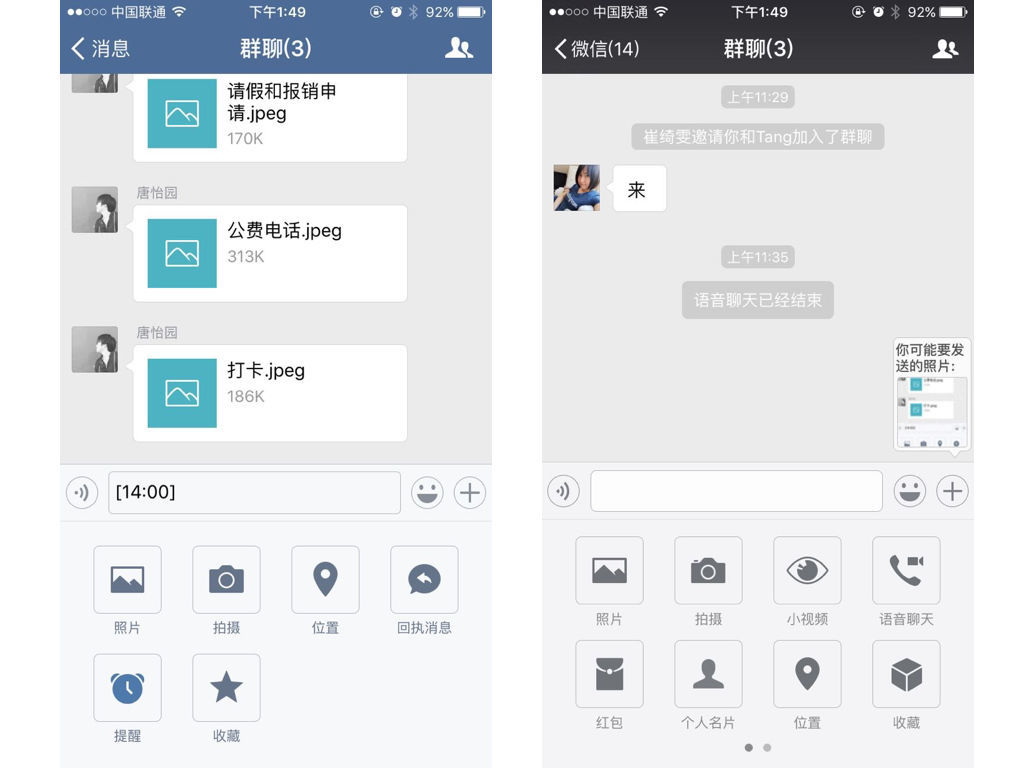 左邊是企業(yè)微信,右邊是普通微信,聊天對(duì)話框里面的可用組件不一樣,例如語音聊天、紅包等功能都沒了。