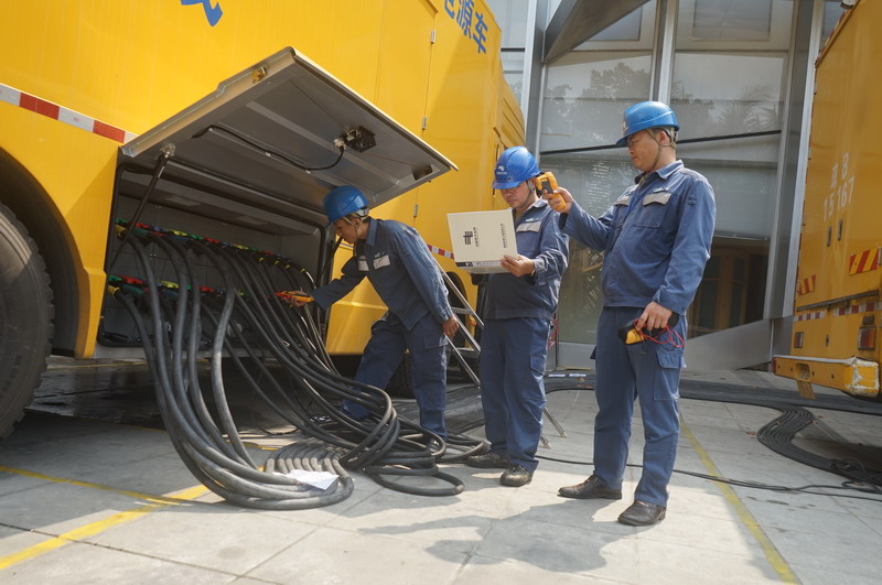 海南電網(wǎng)三亞供電局工作人員正在調(diào)試檢修應急發(fā)電車。林丹丹 攝
