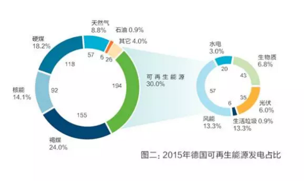 德國(guó)能源轉(zhuǎn)型成效卓著,2015年德國(guó)年發(fā)電總量達(dá)648太瓦時(shí),可再生能源發(fā)電194太瓦時(shí),占發(fā)電總比重的30%。其中尤以風(fēng)光發(fā)電為主,分別占比13.3%與6%。