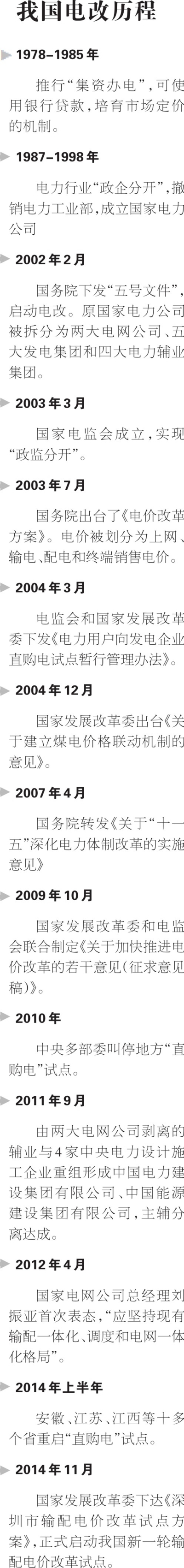 從以上信息不難看出,新電改的思路已經(jīng)不同于2002年“五號文件”中“廠網(wǎng)分開、主輔分離、輸配分開、競價上網(wǎng)”的改革目標(biāo),改變意味著什么?中國經(jīng)濟(jì)導(dǎo)報記者通過采訪相關(guān)專家和企業(yè),帶讀者一起走進(jìn)中國電改,從發(fā)電側(cè)、輸配側(cè)和售電側(cè)3個環(huán)節(jié)全面了解電改的方方面面,探究電改的未來走向。