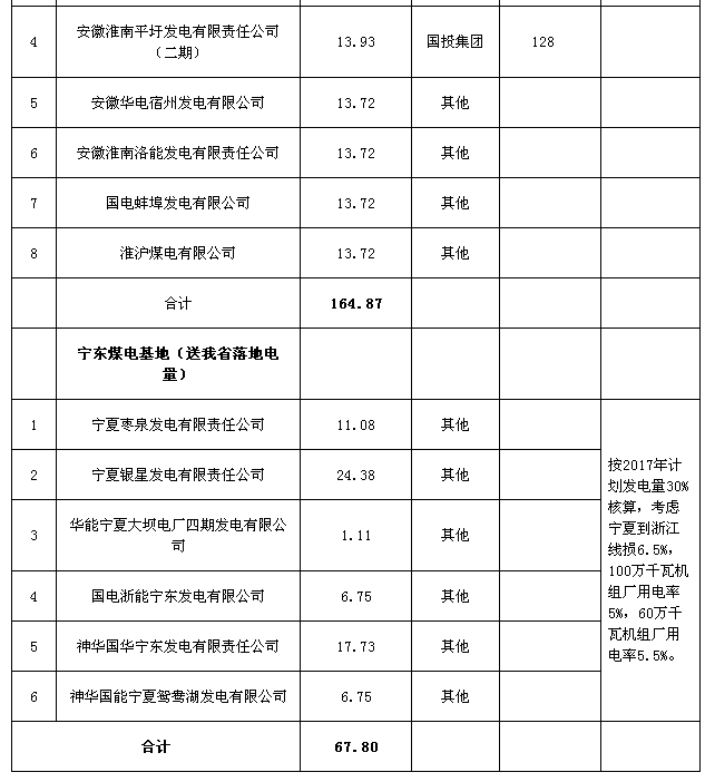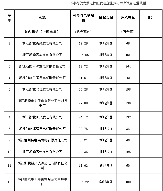 享有優(yōu)先發(fā)電權的發(fā)電企業(yè),參與本次試點電量(省內(nèi)發(fā)電企業(yè)為上網(wǎng)電量,省外發(fā)電企業(yè)為送我省落地電量,下同)計291.48億千瓦時,具體名單和參與試點電量詳見附件1。其他發(fā)電企業(yè)參與本次試點電量限值計1266.91億千瓦時,具體名單和可直接交易電量限值詳見附件2。各發(fā)電集團燃煤電廠(不含2017年新投產(chǎn)機組和未正式明確送我省電量的機組),參與本次試點電量限值及裝機容量詳見附件3。