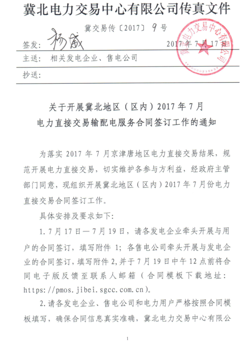 冀北電力交易中心發(fā)布了《關(guān)于開展冀北地區(qū)(區(qū)內(nèi))2017年7月電力直接交易輸配電服務(wù)合同簽訂工作的通知》,通知中稱,組織開展冀北地區(qū)(區(qū)內(nèi))2017年7月份電力直接交易合同簽訂工作。7月17日-19日,各發(fā)電企業(yè)牽頭開展與用戶合同簽訂。詳情如下: