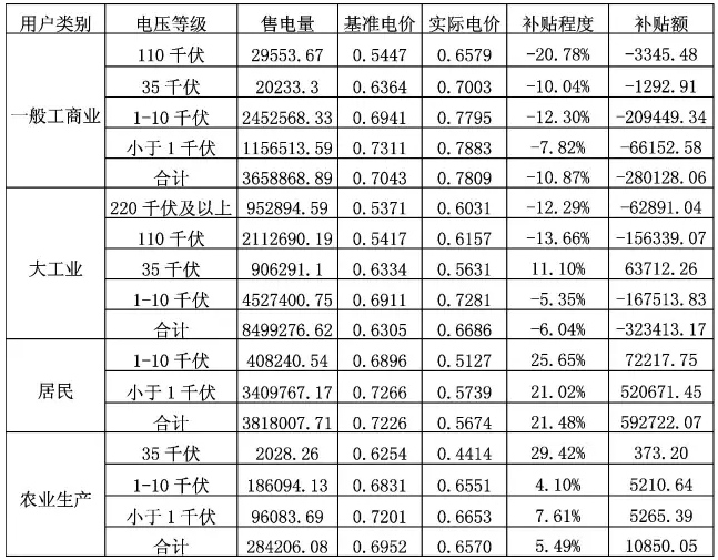 表1 某省2016年分壓分類交叉補(bǔ)貼數(shù)額及程度 單位:萬千瓦時(shí)、元/千瓦時(shí)