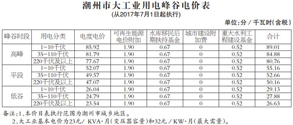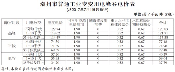從2017年1月1日起,潮州市大工業(yè)電度電價和一般工商業(yè)電度電價均每千瓦時統(tǒng)一降低2 33分。2017年4月1日起,取消城市公用事業(yè)附加;2017年7月1日起,將國家重大水利工程建設基金的征收標準每千瓦時降低0 18分,大