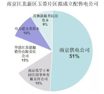 南京江北新區(qū)玉帶片區(qū)增量配電業(yè)務(wù)改革試點(diǎn)項(xiàng)目采用的是這種模式。擬成立的配售電公司中,國網(wǎng)江蘇省電力公司南京供電公司,占股51%;南京化學(xué)工業(yè)園公用事業(yè)有限責(zé)任公司占股15%;華能江蘇能源銷售有限責(zé)任公司占股15%;社會(huì)資本方占股19%,其中電力建安類資本占股10%,其他能源類民用資本占股9%。