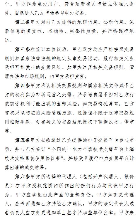 從上海電力交易中心獲悉,上海電力交易中心日前發(fā)布了關(guān)于電力用戶(hù)入市協(xié)議。協(xié)議共計(jì)十四條內(nèi)容,為了市場(chǎng)主體順利開(kāi)展各項(xiàng)交易業(yè)務(wù),交易雙方根據(jù)交易規(guī)則及相關(guān)管理辦法,遵循平等、自愿、公平和誠(chéng)信的原則,簽訂如下協(xié)議: