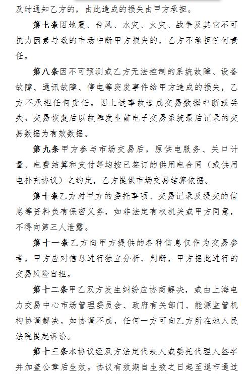 從上海電力交易中心獲悉,上海電力交易中心日前發(fā)布了關(guān)于電力用戶(hù)入市協(xié)議。協(xié)議共計(jì)十四條內(nèi)容,為了市場(chǎng)主體順利開(kāi)展各項(xiàng)交易業(yè)務(wù),交易雙方根據(jù)交易規(guī)則及相關(guān)管理辦法,遵循平等、自愿、公平和誠(chéng)信的原則,