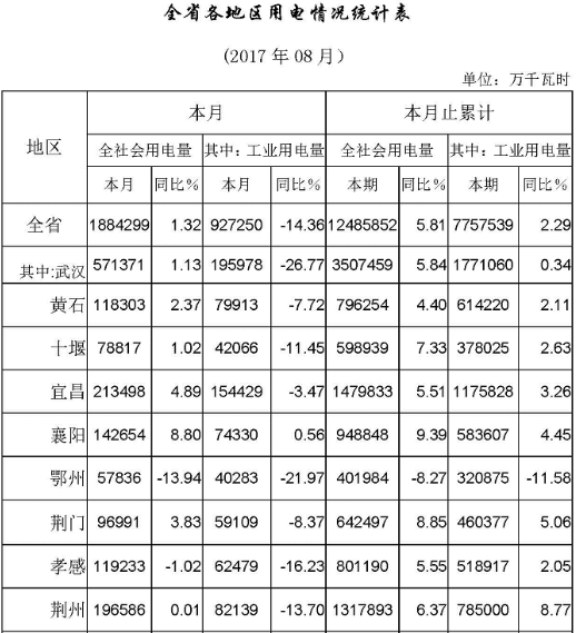 (五)全省各地區(qū)全社會用電絕大部分增長。8月份全省14個用電統(tǒng)計地區(qū)中,武漢、宜昌、襄陽等10個地區(qū)全社會用電不同程度增長,僅鄂州、孝感、黃岡和恩施4個地區(qū)用電下降,鋼鐵、煤炭等去產(chǎn)能是拖累當(dāng)?shù)厝鐣秒娫龇闹饕颉J芫€損較大影響,本月各地工業(yè)用電情況出現(xiàn)失真,盡管各地工業(yè)用電出現(xiàn)不同程度降幅,但從我委監(jiān)測的重點(diǎn)工業(yè)企業(yè)用電情況看,生產(chǎn)基本正常。