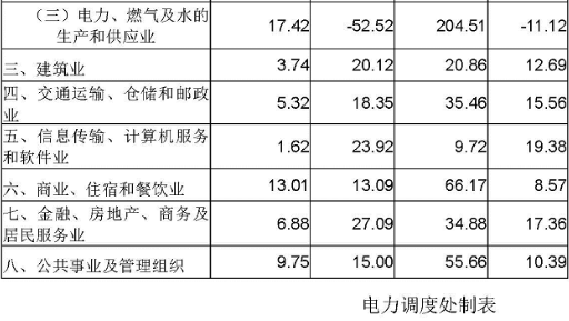 (四)除工業(yè)外全社會其他七個大類行業(yè)用電普遍快速增長。除工業(yè)外,全社會其他7大類行業(yè)用電形勢總體良好,具體為:農(nóng)林牧漁業(yè)(6.07%)、建筑業(yè)(20.12%)、交通運(yùn)輸倉儲郵政業(yè)(18.35%)、信息傳輸計算機(jī)服務(wù)和軟件業(yè)(23.92%)、商業(yè)住宿餐飲業(yè)(13.09%)、金融房地產(chǎn)業(yè)(27.09%)、公共事業(yè)及管理組織(15.00%)。
