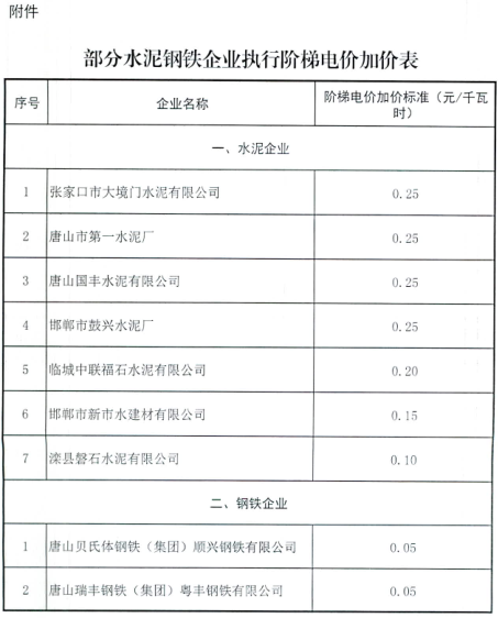 按照河北省發(fā)展和改革委員會(huì)、河北省工業(yè)和信息化廳《關(guān)于水泥企業(yè)用電實(shí)行階梯電價(jià)政策有關(guān)問題的通知》(冀發(fā)改價(jià)格〔2017〕361號(hào))和《關(guān)于運(yùn)用價(jià)格手段促進(jìn)鋼鐵行業(yè)供給側(cè)結(jié)構(gòu)性改革有關(guān)問題的通知》(冀發(fā)改價(jià)