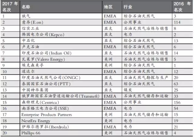 前10名分別為俄氣、德國(guó)公用事業(yè)巨頭意昂(E.on)、印度信實(shí)工業(yè)(Reliance Industries)、韓國(guó)電力公司(Kepco)、中石化、俄羅斯盧克石油(Lukoil)、印度石油公司(Indian Oil)、美國(guó)煉油商瓦萊羅(Valero Energy)、??松梨谝约胺▏?guó)道達(dá)爾。