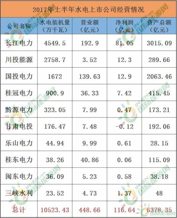 2017年上半年,除五大四小外的十家最大的水電上市公司總裝機(jī)量達(dá)到1.05億千瓦,占到了全國水電總裝機(jī)的31.88%,實(shí)力強(qiáng)勁。的裝機(jī)量與運(yùn)營情況:
