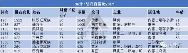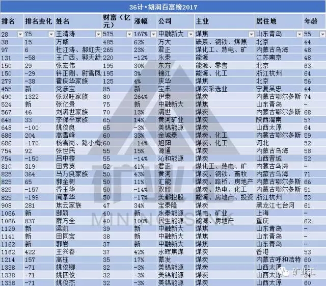 去年,中融新大以215億排名103;17年中融新大排名28位,財(cái)富575億,名次提升75位,財(cái)富增長(zhǎng)360億!可見這一年中融新大業(yè)績(jī)大好。除這位煤炭行業(yè)中的新首富外,榜單中還有不少新上榜的煤炭行業(yè)人士,“煤老板”風(fēng)光再現(xiàn)。