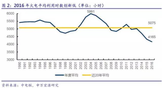 2016年度火電平均利用小時(shí)數(shù)創(chuàng)歷史新低,產(chǎn)能過(guò)剩問(wèn)題凸顯。2016年全國(guó)火電設(shè)備平均利用小時(shí)為4165小時(shí),同比減少199小時(shí),創(chuàng)1964年以來(lái)新低。參考近20年火電設(shè)備平均利用小時(shí)5075算,火電產(chǎn)能過(guò)剩逾20%;參考?xì)v史最高利用小時(shí)5991,火電產(chǎn)能過(guò)剩逾40%。