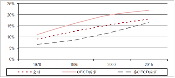 1970-2015年全球電力消費在終端能源消費中的占比