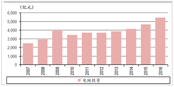 近年來電網(wǎng)投資額穩(wěn)中有升:自2011年以來,我國電網(wǎng)投資變化趨勢基本表現(xiàn)為穩(wěn)中有升。2015年《配電網(wǎng)改造行動計劃》規(guī)劃2015-2020年,全國配電網(wǎng)新建和改造投資不低于2萬億元,其中“十三五”期間投資額不低于1.7萬億元,此外,近期電力“十三五”規(guī)劃中明確提出“十三五”期間全國電網(wǎng)投資額不低于3.34萬億元。受益于配網(wǎng)投資總額提高,2016年全國電網(wǎng)投資額達(dá)到5,426億,同比增長17.88%,創(chuàng)下近年來增速新高。