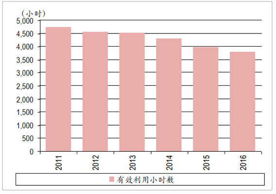 2011-2016年我國發(fā)電設(shè)備有效利用小時數(shù)