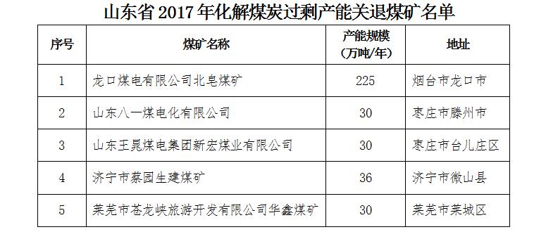 山東省2017年煤炭行業(yè)化解過剩產(chǎn)能情況公告