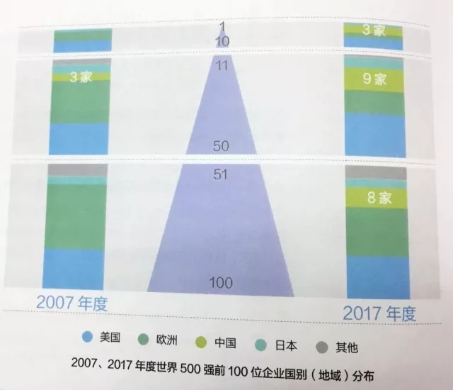 一是上榜企業(yè)數(shù)量大幅增加。2007-2017十年間,中國(guó)500強(qiáng)上榜企業(yè)數(shù)量由30家上升到115家,增長(zhǎng)了約2.8倍,中國(guó)與美、歐之間的差距顯著縮小,且遠(yuǎn)超日本,成為500強(qiáng)企業(yè)中迅速崛起的主要力量。