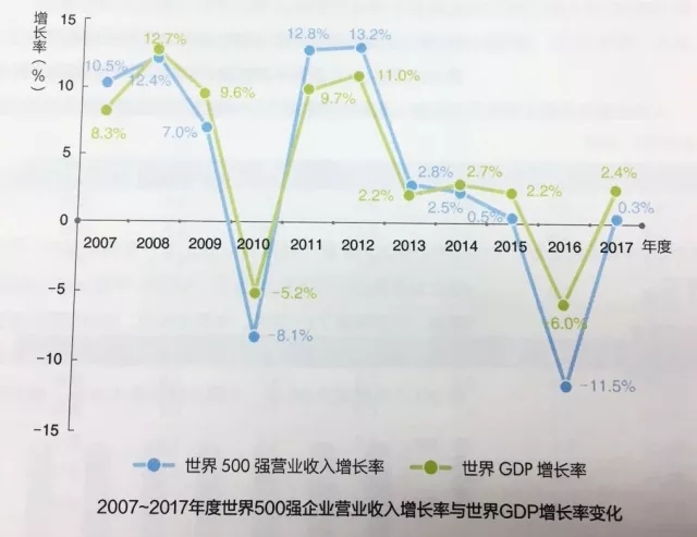 從總量上看,2007-2017十年間,世界500強(qiáng)企業(yè)營(yíng)業(yè)收入總額從21萬(wàn)億美元增長(zhǎng)到28萬(wàn)億美元,與世界GDP總額的比值始終穩(wěn)定在40%左右。